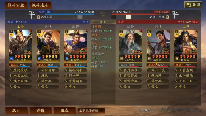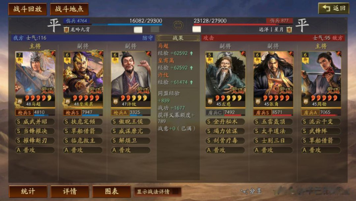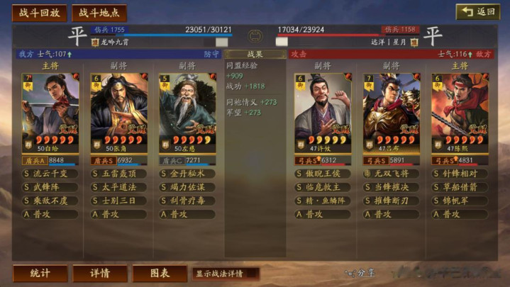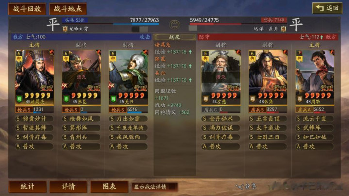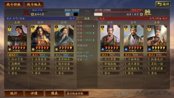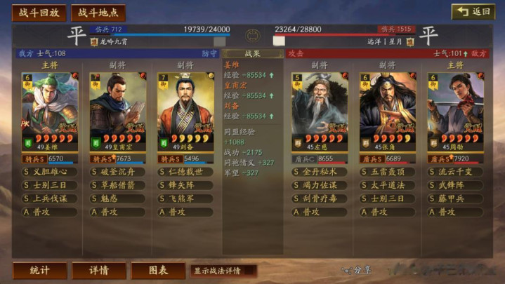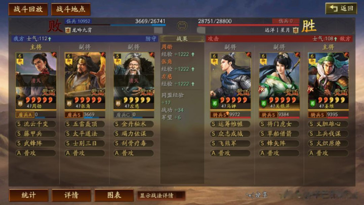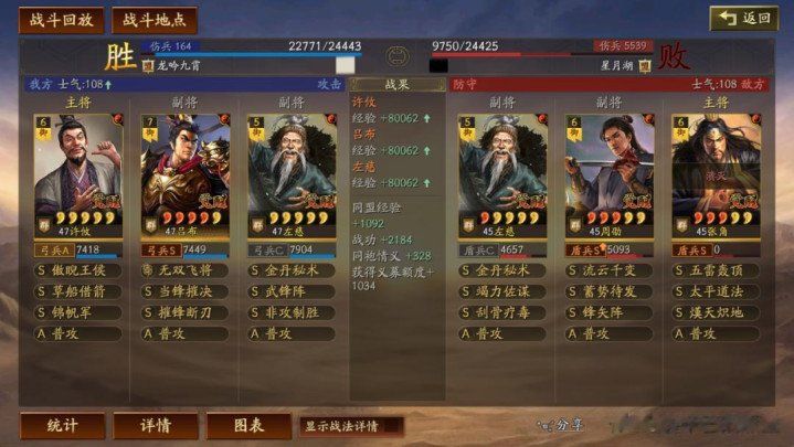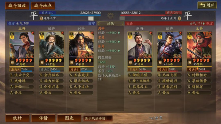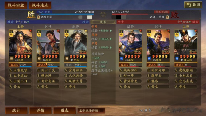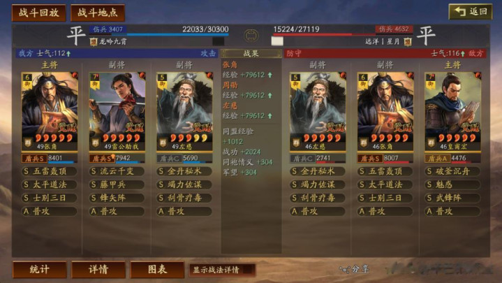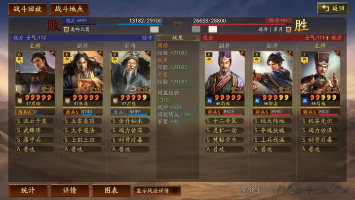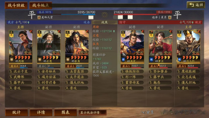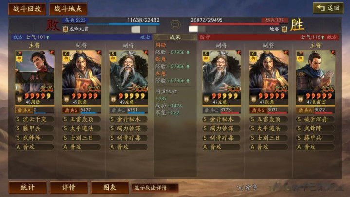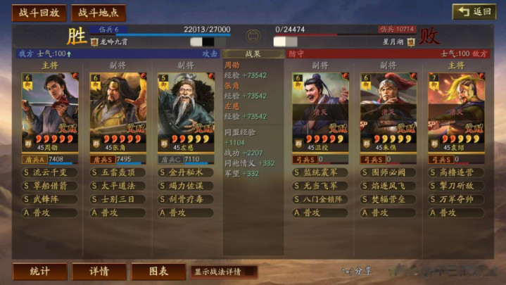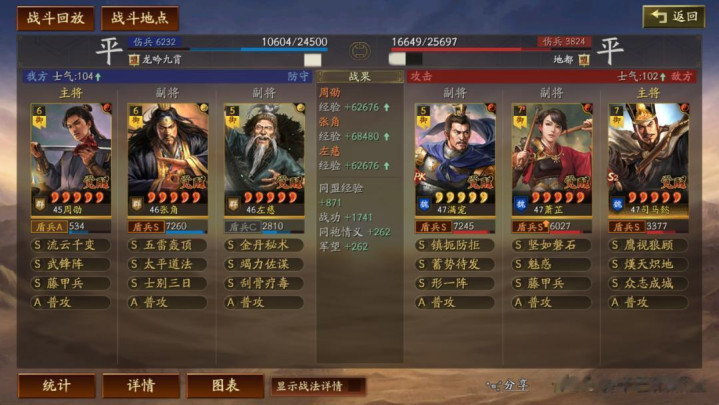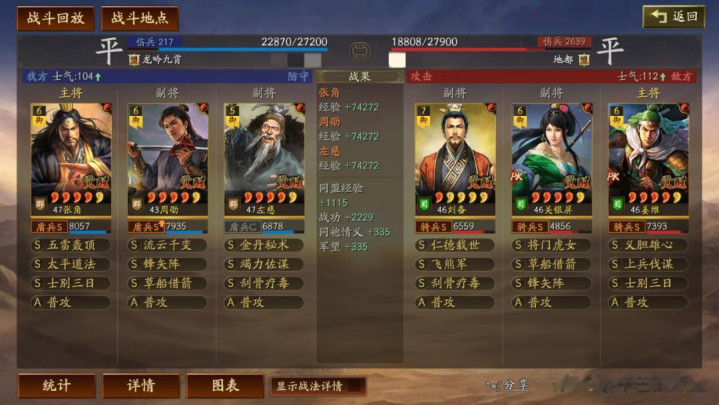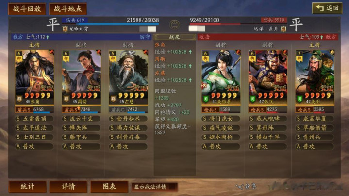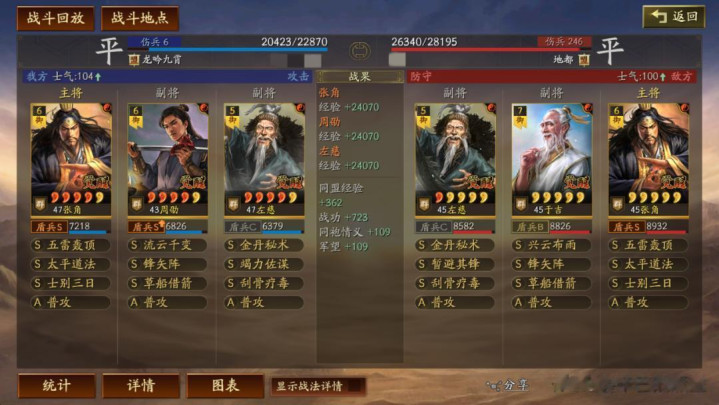左慈常规兵书,援其必攻+散仙+掩虚;周劭是三军之众+统军+锤炼;张角这里需要说一下:由于这个剧本有疾战突围宝物,如果你选择带疾战突围宝物,那么张角可以考虑选择带三军之众+归心+久战兵书。