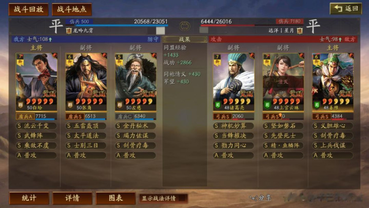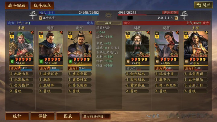 周劭的战法,锋矢阵或者武锋阵二选一。然后是藤甲兵,藤甲兵的位置有些小伙伴可能会选择草船,甚至其他战法。这里其实就是仁者见仁了.我个人很喜欢藤甲,战场上碰到各种兵刃队伍可以保血线。如果你和我的游戏风格不同,也可以选择其他的战法。