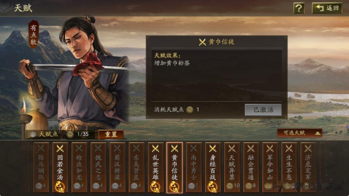 兵种提升S和群雄阵营需要则选上,身经百战这个四项属性提升5%的也基本是刚需,在这个基础上,辛巴这套锋矢阵的千机盾,由于张角做主将,周劭会选择增加黄巾标签的黄巾信徒天赋,以及两个武将就可以激活缘分的高朋满座天赋。