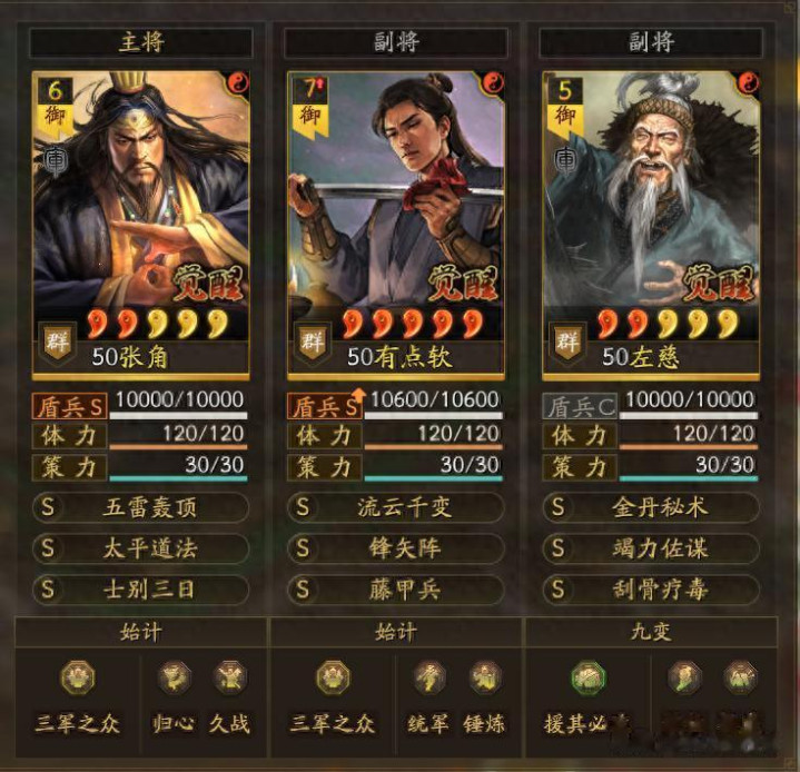张角太平士别,左慈竭力刮骨,这都是标配。注意!这里有左慈的战法会有常见的两个小问题: