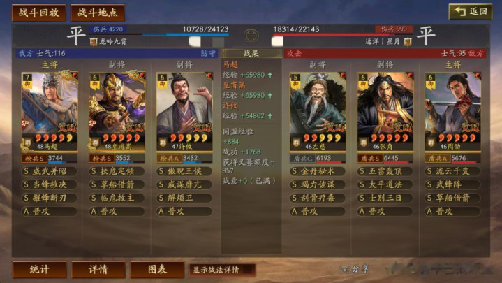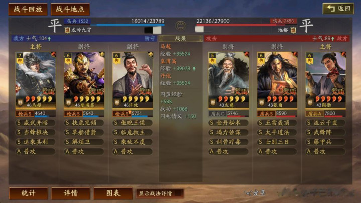 武锋阵:张角输出逐渐提升,相比锋矢阵的天赋,周劭自带战法少了发动概率的加持,而且级别较低的时候,周劭由于做主将承受挑拨效果,兵种A,属性差,导致容易暴毙。后期随着科技提升,官职提升,包括天赋提升,情况有所缓解。