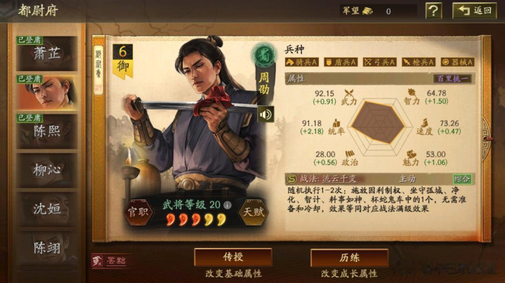 如辛巴前面所说:如果你拜师了诸葛或者司马懿等龟速武将,张角沉底尾速,周劭二速,左慈一速。如果像我拜师了非龟速武将,那就左慈二速,张角尾速,尽量贴速,周劭就只能放飞了。其他的属性点:周劭主统率副智力,左慈张角全智力。
