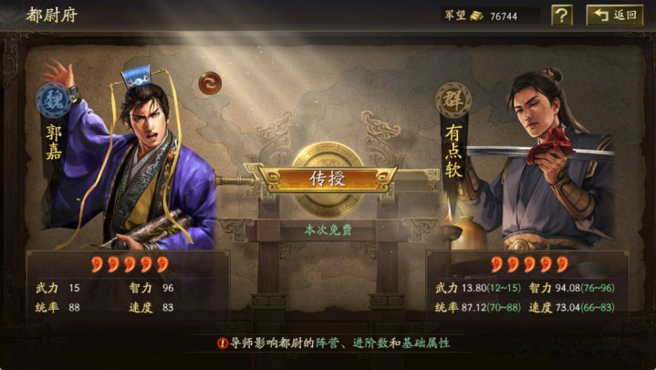 周劭的拜师如何选择?常规选择是统率和智力都高的武将,且速度越慢越好。因为张角是个龟速武将,周劭又有净化效果,所以沉底速稍微领先张角打净化或者补续航甚至提升属性。综合以上,诸葛亮、司马懿是常见的拜师武将,像辛巴的账号,由于司马懿和诸葛亮都不红,就选择拜师了郭嘉。